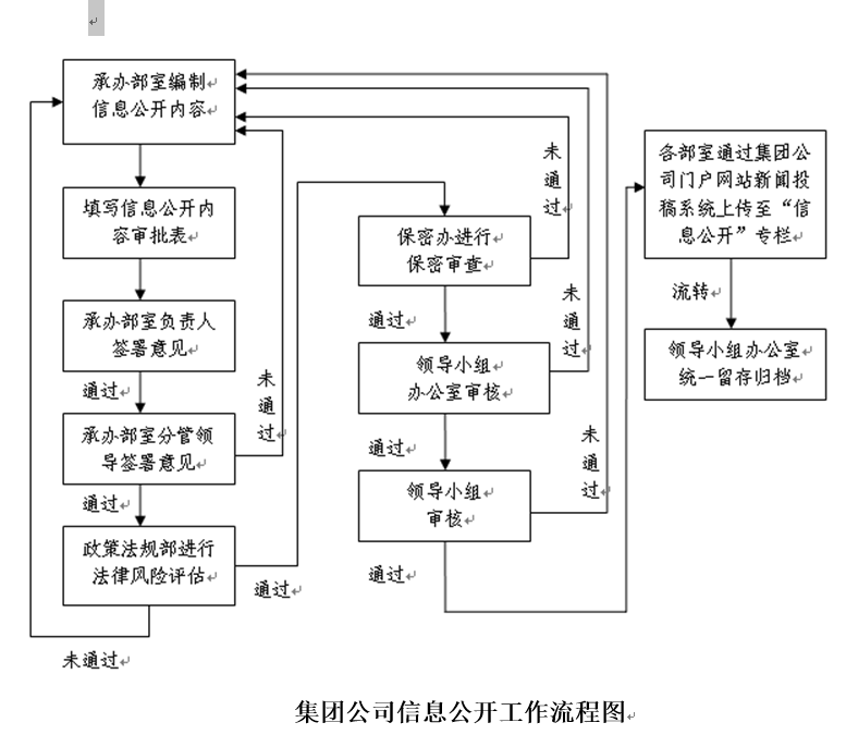 信息內(nèi)容審核。集團(tuán)公司各部室編制完成相關(guān)信息內(nèi)容后,及時(shí)填寫《集團(tuán)公司信息公開審批表》(附件),報(bào)送政策法規(guī)部進(jìn)行法律風(fēng)險(xiǎn)評估,隨后提交保密辦進(jìn)行保密審查,并履行領(lǐng)導(dǎo)小組審核程序。