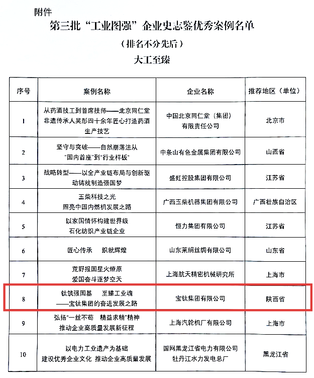 經前期認真籌備,近日,寶鈦集團成功入選工信部工業(yè)文化發(fā)展中心第三批“工業(yè)圖強”企業(yè)史志鑒優(yōu)秀案例名單。