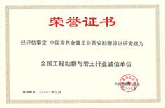 The Institute is in the first group of comprehensive type and class A engineering investigation units and first grade foundation bed and foundation engineering foundation professional contracting enterprises inspected and approved by the national-level authority, it has obtained the honorary titles of ?°National Advanced Engineering Investigation Unit?±, ?°China Top 100 Investigation Design Units in comprehensive strength?± and ?°China Construction System Enterprise Reputation AAA Grade Unit?± and has been evaluated as ?°Contract-honoring and Promise-keeping Enterprise?± by Shaanxi Provincial People?ˉs Government for consecutive years, and it was evaluated as ?° Honest Unit in Investigation and Design Industry in Shaanxi Province and China?± in 2007.